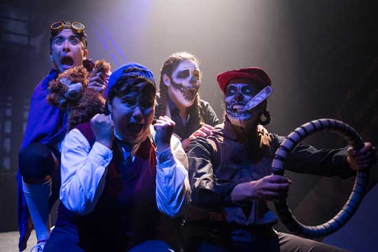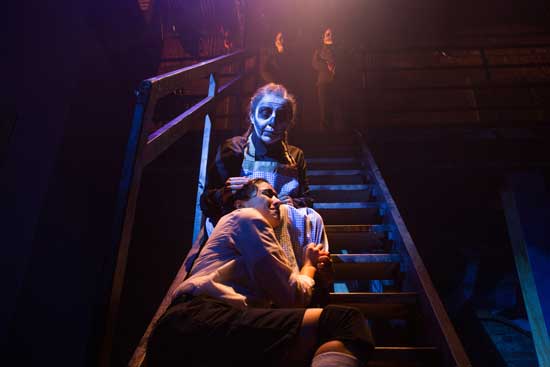 Lorena Diaz, Wendy Mateo and Isabel Quintero play all of the other characters in the story – everything from playground bullies to teachers to parents to bad cops. All three are wearing death mask makeup, as are the children in the choir, Esme Ayvar-Perez, Maggie Baker, Angelina Bill, Isabel Bravo, Abigail Caruga, Lillian Crespo, Jessica Farfan, Alex Gegax, Janet Rios and Audrey Webb.