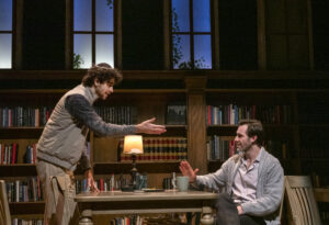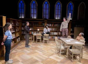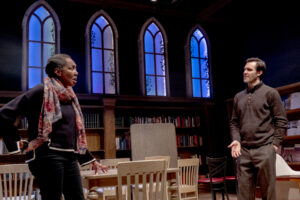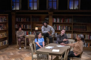 Asaf ( a powerful performance by Jordan Lane Shappell) is a college professor and guidance counselor for students. He and his wife, Gwen ( deftly handled by K Chinthana Sotakoun) seem to have a pleasant life living on this unnamed college campus, despite the city having some problems ( racial and religious). Sharpley directed by Jeremy Wechsler, on a magnificent set designed by Joe Schermoly, you will feel that you are at a fairly prestigious university. The majority of the action takes place in a library with great windows and tons of books. The set transforms, or at least part of it ,to their home, and other spots, allowing the action to be non-stop ( except for the intermission between the two acts (2 1/2 hours including intermission).