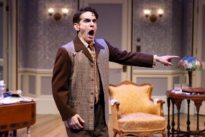 Olga (Erin Noel Grennan), the unrestrained manager of the mansion, is the glue that holds the story together. Grennan, in an extraordinary performance, is hauntingly expressionless, and her character is unfazed by the people and circumstances surrounding her. A nod to the Hungarian roots of Ferenc Molnar, she is definitely no wallflower. Scary and fussy, she offers her opinions freely: straightaway expressing her cynicism about theatre people while commenting on Margot’s alleged promiscuity (which, incidentally, is apparent to everybody but Oliver). All the while, she begrudgingly caters to the houseguests and fulfills their requests for food, champagne, and creature comforts. Grennan’s acting is exceptional, and an opening night crowd gave her an especially hearty round of applause.
