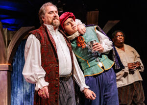 Design-wise, the show works well, utilizing every square inch of limited space so the stage does not feel too overcrowded. This gives the actors room to breathe. And they do so in the most wonderful period costumes by Rachel M. Sypniewski. I sat close to the actors on stage and marveled at the rich textures, colors and patterns of these beautifully designed and constructed garments. The scenic design (Trevor Dotson), sound (Alex Trinh) and lighting (Jackson Mikkelsen) seamlessly shift scenes with minimal distraction between eight different settings in London and Stratford-upon-Avon.