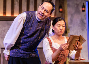 Brendan Hutt gave a dynamic performance as Richard Burbage, the actor with the most extensive institutional memory post-fire and who dies suddenly early into the story. Jared Dennis, who delivered a particularly heartfelt and moving performance as John Heminges, and Ben Veatch, who conveyed a gentleness and conviction as Henry Condell, hatch the scheme to recreate and publish the plays as Shakespeare wrote them. The two men must recreate the bits and pieces which remain, often from faith and memory. Their wives, Rebecca Heminges (lovely performance by Anne Sheridan Smith) and Elizabeth Condell (Sabine Wan showing solid theatrical flair) are equal partners and are invested in the folio because they love the plays and characters as much as their husbands.