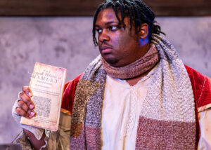 Design-wise, the show works well, utilizing every square inch of limited space so the stage does not feel too overcrowded. This gives the actors room to breathe. And they do so in the most wonderful period costumes by Rachel M. Sypniewski. I sat close to the actors on stage and marveled at the rich textures, colors and patterns of these beautifully designed and constructed garments. The scenic design (Trevor Dotson), sound (Alex Trinh) and lighting (Jackson Mikkelsen) seamlessly shift scenes with minimal distraction between eight different settings in London and Stratford-upon-Avon.