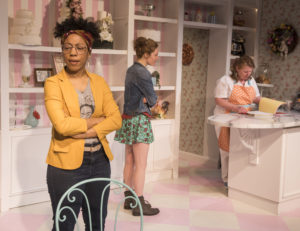 The play begins in Della’s bakery. Della ( Tara Mallen in a role that seems to have been written with her in mind) is a local, almost personality who is known for her wonderful cakes. In fact, so legendary are they, she is now a contestant on “The Great American Baking Show”. Her husband , Tim ( the always reliable Keith Kupferer) is a plumber and a man who cares about his wife, but in a way that we learn is not what she wanted. Enter Jen ( deftly handled by Tuckie White) a long-time friend of the family who has come to town from Brooklyn in order to have her wedding and of course, wants her “almost aunt Della” to do the cake. Della is excited for her and to do the cake, until she finds out that the wedding will not be a traditional one and that a young lady who she assumed was a reporter interviewing her, Macy ( an incredible character study by Krystel McNeil) is not a reporter, but, in fact the intended “Bride”!