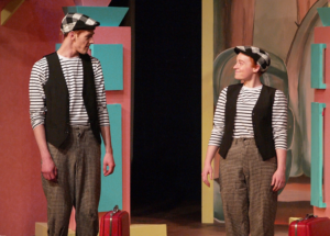 I did a little prep work with both the guys prior to the show, bringing the English teacher in me out of summer hibernation for just a moment. I explained that the story revolves around the confusion of two sets of twins, both separated at infancy. And I told them that it’s not important to catch every word spoken, but to try and understand the general idea. (More “top tips for communing with the Bard” are offered in the playbill.) If 14 years of teaching English has taught me anything, it’s that, unfortunately, Shakespeare can be a hard sell. I think starting with a comedy gives you a leg up, and it helps to acknowledge the poetic language before it hits their ears. Now, the drama of the first scene, including Egeon’s emotional monologue, powerfully performed by James Pickering, initially challenged my “it’s funny!” claim. But patience is key in appreciating Shakespeare and the guys were patient. Something, too, about the set, designed in colors that would make any Miami Vice fan smile, along with the contemporary music used through scene transitions, alluded to the fun that would follow.