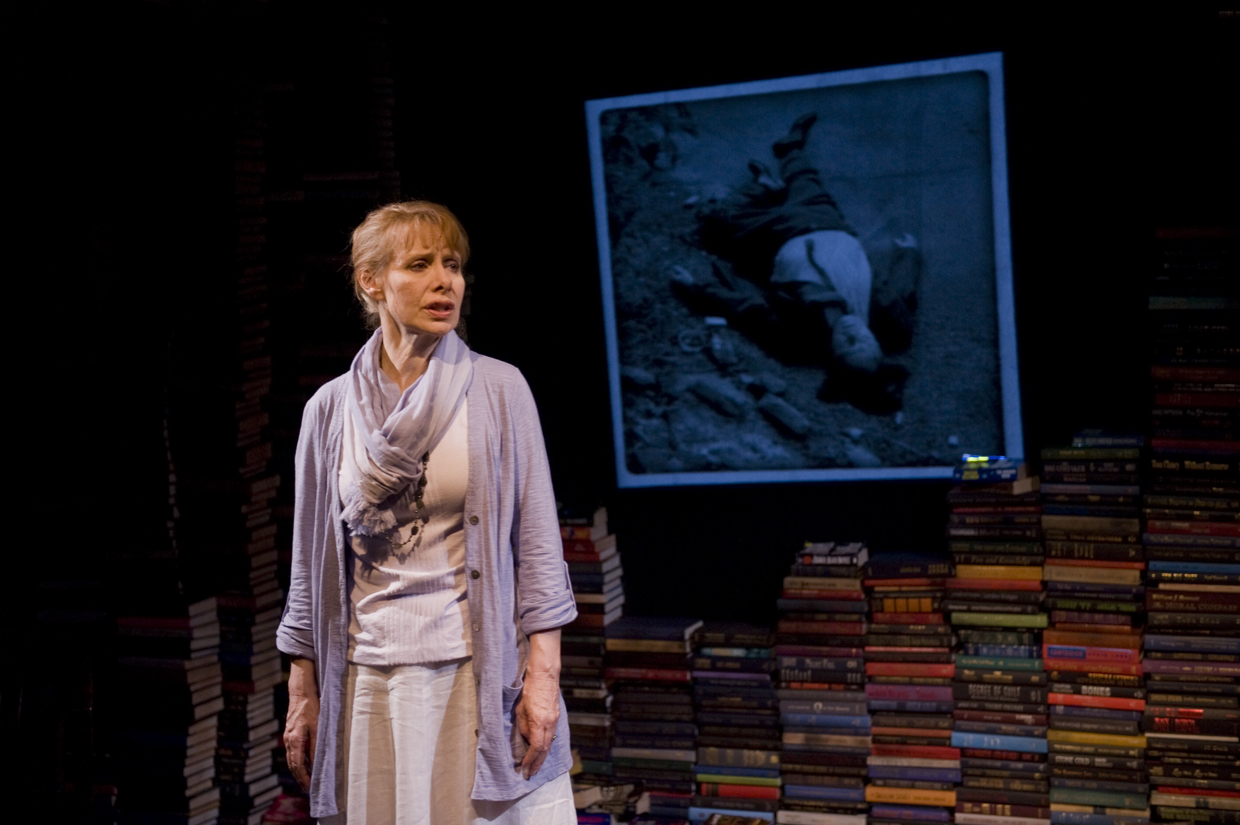 What make this production complete is the music and sound by Rob Milburn and Michale Bodeen and special lighting by Heather Gilbert as well as some great projection work by Mike Tutaj and an enormous amount of props by Nick Heggestad. For those of you who have been to Writers’ Bookstore location ( yes, it is in the rear of the local bookstore) this is a very intimate venue ( around 60 seats) and so we, the audience are up-close with Ms. Robertson and get to watch her every gesture as if we were in the room with her and she was speaking to us one-on-one as she rebuilds her life after the tragedy. Her loss of voice has made her aware of other forms of communication and text messaging and e-mail are now part of her day. As the story goes on, we learn through her discoveries that there is much more to this case than meets the eye and with Huff’s writing,griffin’s direction and Robertson’s character building, you are in for a treat- two acts, one forty minute, the other 50 minutes of magic on stage. The ending will astound you!