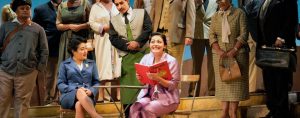 Donizetti’s music in this comedy is happy and uplifting, but it tends heavily toward dialogue. By far the show’s most famous aria, Una furtiva lagrima, is sublime, and Castronovo’s rendition does it justice, but for the rest of the show, it’s easy for an audience member to just go along with the legato. The audaciousness of Ketelsen’s Dulcamara is another highlight; while updating the rest of the setting to the 1950s, Slater basically makes Dulcamara the Wizard of Oz, and for all his grifting, he does form a bridge to a kind of magic. Although this is a show where you look at the supertitles a lot, it felt natural enough for most of the audience at the opening matinee to chuckle along with each development. For people who rarely attend operas, The Elixir of Love is a welcoming entry point, and for long-time fans, it’s vindication for an old favorite.