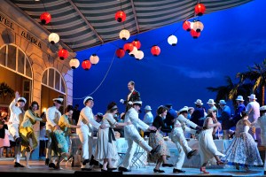 Our hero, Nemorino (Charles Castronovo), works at a hotel restaurant where we first see him taking naïve pride in placing each chair in exactly the right place. He loves the bookish, bold, and sophisticated Adina (Ailyn Pérez), but she hardly seems to notice him, being much more interested in reading from dramatic romances such as Tristan und Isolde than the humble, simple man in front of her. When the swaggering captain Belcore (Johua Hopkins) declares his intent to seduce and marry her, Adina bluntly reassures Nemorino that he’s the better man, but she’s fickle and needs someone who can keep her entertained. Nemorino is heart-broken until the arrival of the magical doctor Dulcamara (Kyle Ketelsen), who offers Nemorino an elixir that will make him confident, charming, and witty, and hopefully allow him to win Adina over before she marries Belcore in twenty-four hours. (The elixir’s secret ingredient is alcohol.)