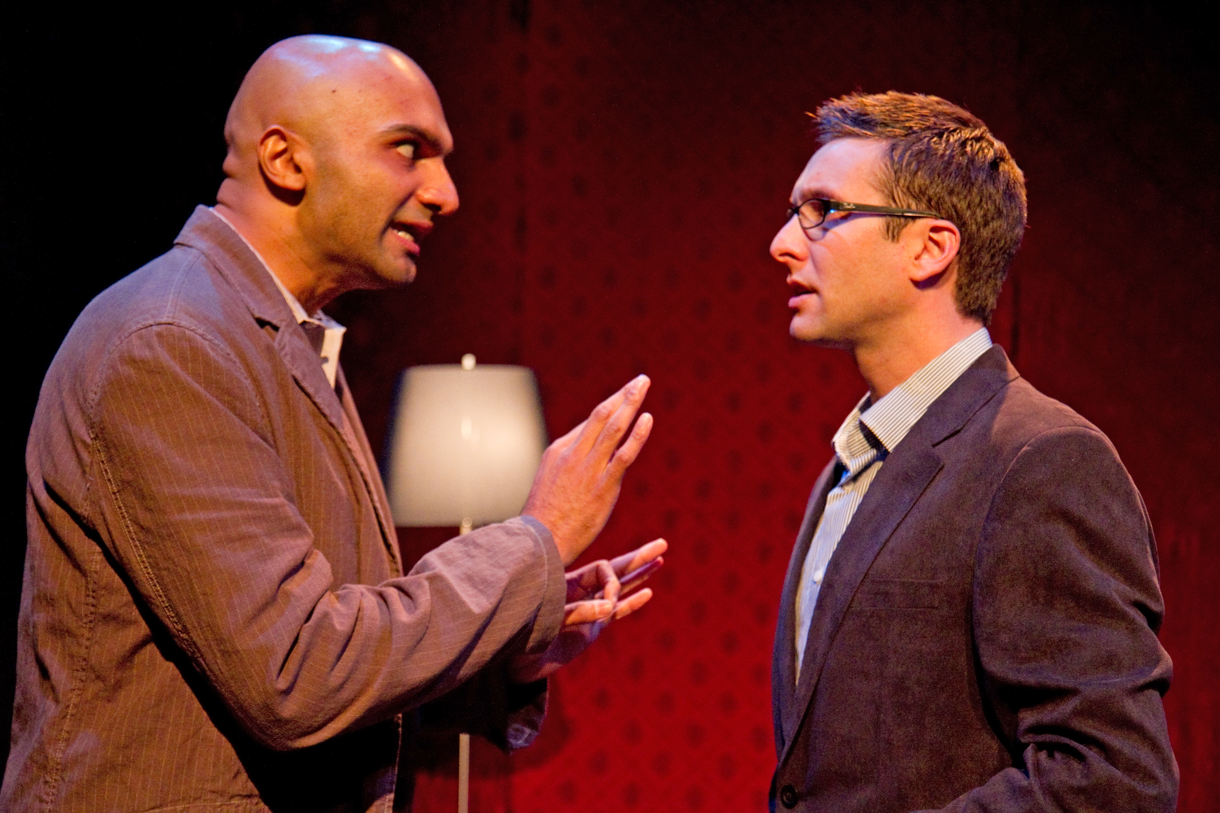 [rating=3] We all have had the experience of making a friend when we were younger, one that remains a friend into our adult lives, but what happens to that relationship when one or the other, or even both become famous? In Theater Wit’s season opener, “The Four of Us” written by Itamar Moses, we get to see the deconstruction of a relationship that changes the lives of these two boyhood friends. There are only two characters in this play- David ( a quality performance by Usman Ally) and Benjamin ( deftly handled by Collin Geraghty). As boys they met when attending summer music camp and remained friends until they reached adulthood. The play begins in a restaurant where Benjamin tells David that he has written a novel that is being published and that the movie rights have been sold as well. David, a struggling playwright appears to be delighted at his friends success, in reality, must reexamine the relationship and bond they have had.