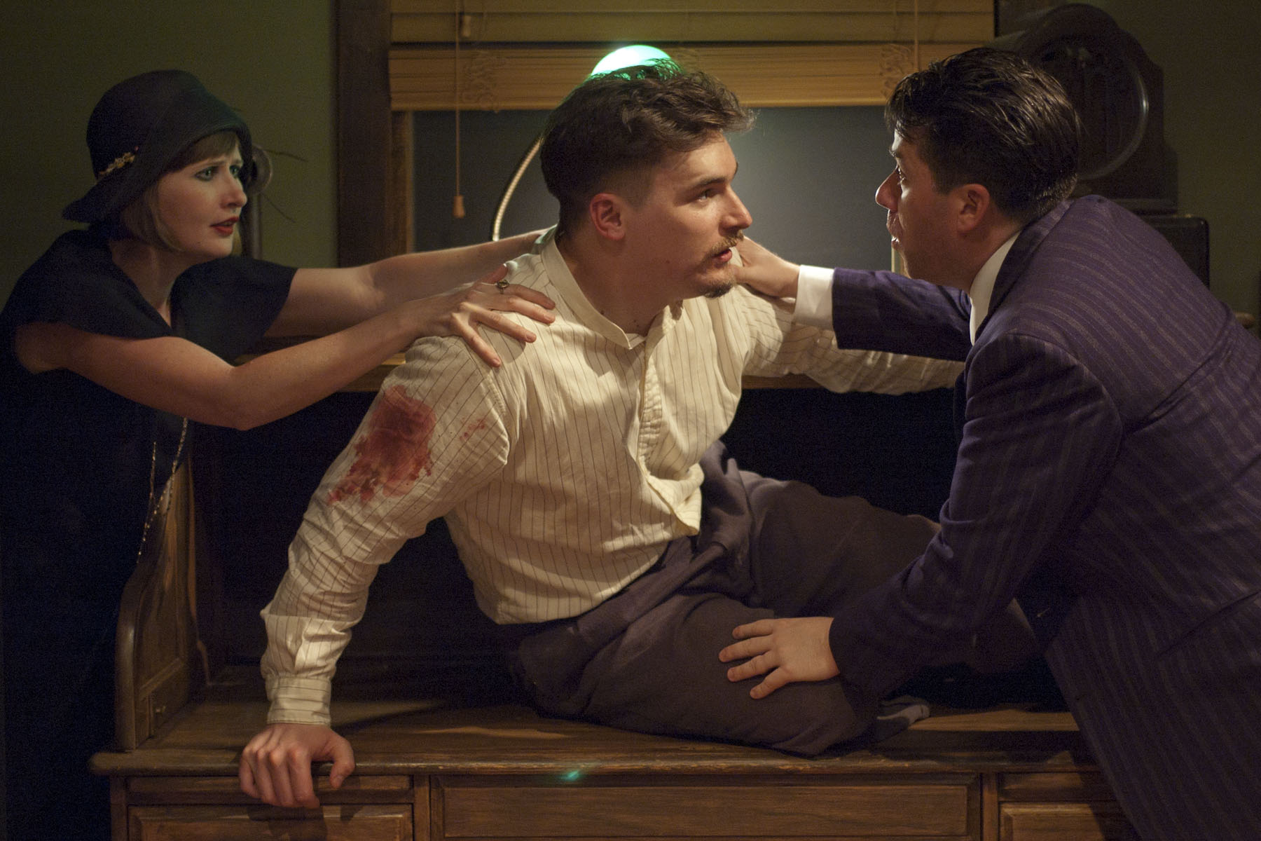 Hecht and Macarthur take us on a ride through the corruption that exists in the Mayor’s office ( a fierce performance by Rob Riley) and the Sheriff ( a comic touch by Bill McGough) as they are days away from election and need to have this hanging to get the votes to remain in. It turns out, the Governor has reviewed the matter and has given Williams a repreive, but the politicos have kept this under their hats. Meanwhile Williams escapes and ends up in the press room with none other than Hildy who brings his editor , Walter Burns ( another dynamic performance by Terry Hamilton, who can handle comedy with the best of them) and the chaos begins. This is pure comedy with an underlying story of what life in Chicago was during this era in our history ( as seen through the eyes of Hecht and Macarthur, who were there) and the colorful characters who made up the story. The other actors in this solid production are Laurie Larson,John Gray,Malcolm Callan,Mechelle Moe ( as Mollie Malloy, a woman who gave her heart to Williams), Bridgette Pechman Clarno ( as the lovely Peggy, Hildy’s betrothed) and Angela Bullard as Peggy’s mother)and John Gray. There are many busy scenes with lots of scrambling and with a large cast this can be very awkward- Bowling makes it work!