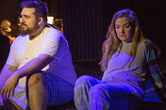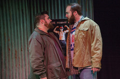 The two main workers, or should I say, unemployed workers, are Jerry ( a solid job by Matt Frye) who is divorced and having some custody battles with his ex, Pam (Anna Dvorchak) and Dave ( deftly handled by Nick Druzbanski). Dave’s wife, Georgie ( a delightful MollyLeCaptain) wants him to take a job at Wal-Mart as a security guard. It is when Dave goes after her at a “girl’s night” with Jerry that they decide they could pull this off.