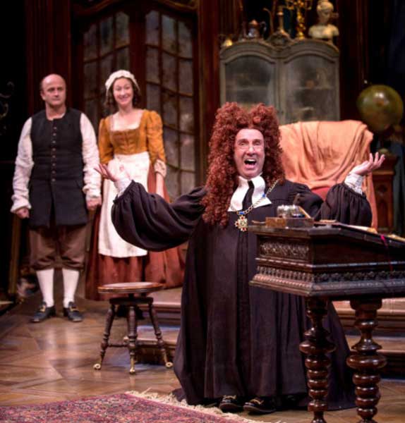 Uncle Geronte (an incredible performance by Paxton Whitehead) is surrounded by a strange mixture of servants and family as well as friends. His maid Lisette ( Jessie Fisher) and her beau Crispin (an outstanding performance by Cliff Saunders, who it appears truly understands the genre of “farce”) are also seeking a bit of gold at the end of their rainbow. Along with Mr. Burger, these three do most of the slapstick “shtick” to the NTH degree. Linda Kimbrough is exquisite as Madame Argante, the lady who desires Uncle Geronte. The other character in the story is the lawyer Scruple (deftly handled by Patrick Kerr) who has an unusual role that will take you by surprise in a wonderful scene about Geronte’s drawing up his will.heir 3