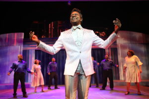 Most of all, Taylor’s direction remains straightforward, allowing the music and the incredible performances to predominate. Also, thanks to her efforts, the costumes shimmer with mid-century glamour. I especially liked how Wilson’s characteristic hairstyle has been successfully replicated by wig designer Dawn Crenshaw. (Remember Brylcreem?) Other wigs and hairpieces have been masterfully coifed to provide just the right curls, swirls, parts, and textures to mimic the styles worn by the original people whom this show is modeled after.