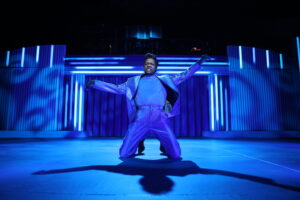 Denise Karczewski’s set and lighting design is spectacular: The simple but elegant and effective multipurpose set, with the band above, nicely sets the mood for each part of Wilson’s life story. I loved the forward and backward motion of center stage. Plus, the twirling areas of stage right and stage left create a flowing continuum from one scene to the next. This fairly blank stage allows for a palette of lights that beautifully frame both the slice of life events and the magnificent showstopper numbers. Not only is the background lighting of purples and turquoises just lovely at the beginning, but I also must mention DJ Douglass’s projection design and Daryl Brooks’s props. Sound design by Sean Alvarez and JaVaughn Hannah could not be better, for is not an easy thing to achieve just the right balance of vocals and instrumentals in combination, especially when the scenes change so quickly from one to the next. Unlike previous shows at Black Ensemble, today’s volume levels are perfect, because they remain consistent between spoken dialogue and singing (although I did have to wear a pair of earplugs). Moreover, the canned music before the show starts and between the two acts is not so loud so that audience members can carry on conversations.