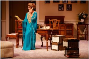 David Rambo’s bio-play takes place late one night as “Eppie” (Brooks) is trying to write a column. The writing isn’t going well – sometimes the words just aren’t there, as I know all too well – so “Eppie” finds excuses not to write. She’d sit down at her desk, type a couple of words, then get up and roam around the room. She’d put on her fur coat, a gift from her husband, she said. She picked up letters from file boxes around the room. She answered the phone, even though she pretended to be annoyed when it rang.