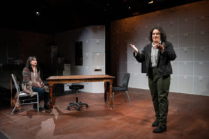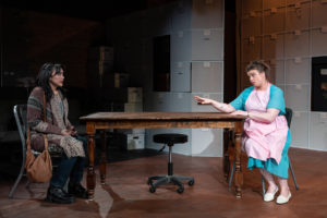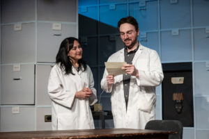 Above all, Anderson’s direction is great! The actors are convincingly distanced on stage whenever they interact among themselves and when they address the audience directly. Movement from one scene to the next is smoothly done, and the audience can easily imagine all sorts of diverse interior and exterior locales without a hitch; the story is never lost. That said, I would have made some different choices regarding the scenic design. The set largely consists of file cabinets, archival boxes, brick walls, and a red tile floor. These, unfortunately, don’t work so well when the scenes shift from the language archive to George and Mary’s house, to the train platform, to the hospital room, etc., etc. To my mind, a multi-purpose set should have been built instead. Perhaps a backdrop in sections could have better framed the action. That said, I liked the props, such as the hospital bed, the display with the different breads, the various placards, and the like, all thanks to Jeremiah Barr’s efforts. Becca Venable’s lighting design and Robert Tobin’s sound design work well in this small space. Costumes by Andrés Mota are fitting. Dialect and vocal coach Bethany Hart and assistant dialect and vocal coach Kelley Holcomb have both done a fine job with imparting an array of accents.