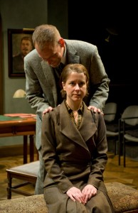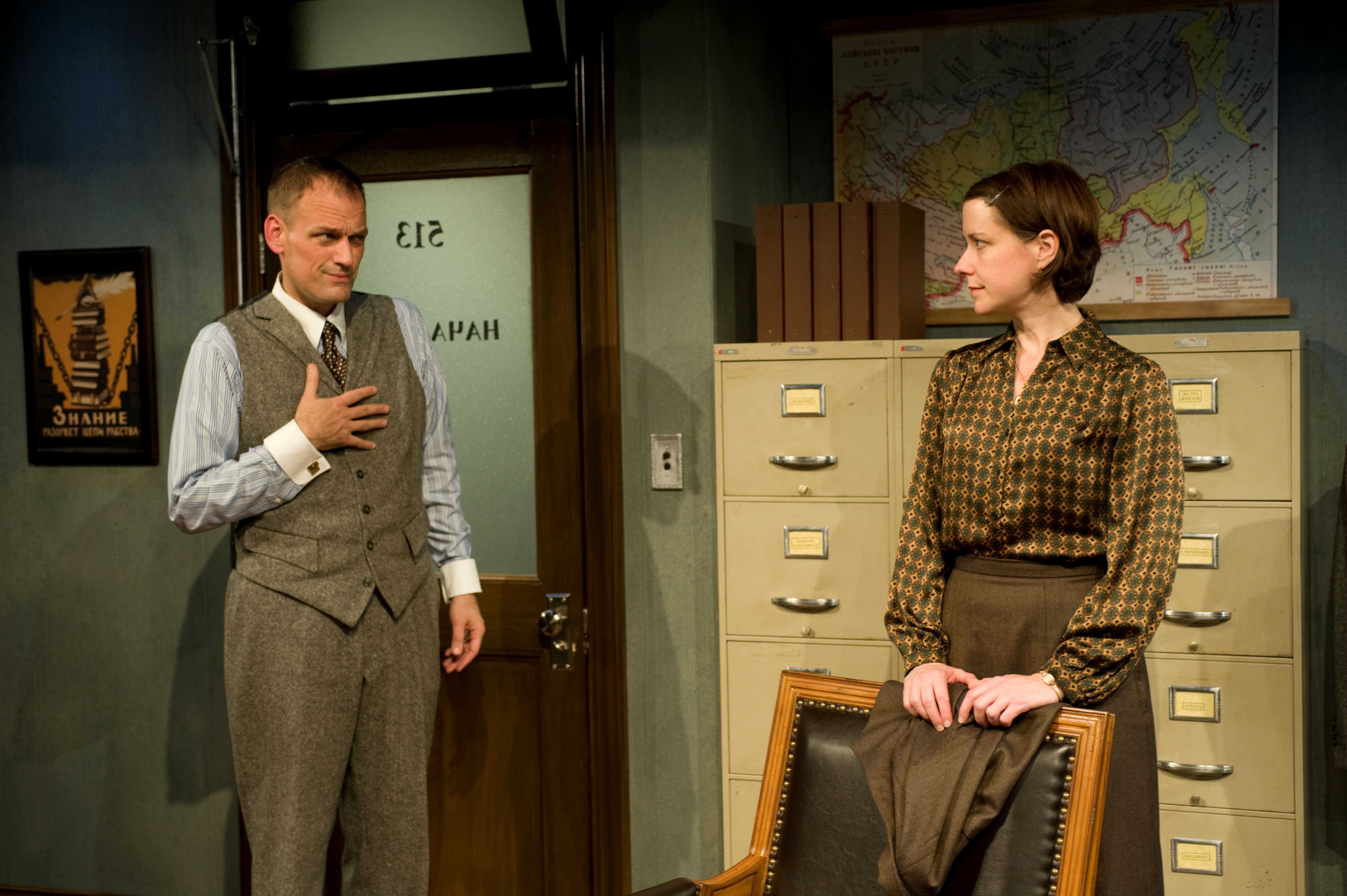 [rating=4]Mystery! Intrigue! suspense!One Upmanship! These are some of the factors you will witness in John W. Lowell’s “The Letters” now on the intimate stage of Writers Theatre located in the back of  Books On Vernon shop in Glencoe. This is a two character play directed cleverly by Kimberly  Senior on a set designed by Jack Magaw that will have you feeling as if you are peeking into an office in Stalin’s Russia in 1931. This is where the story takes place and in this very intimate theater, the audience sits on two sides, probably only 14 feet away from the stage are ( in the last row) as we watch a “cat and Mouse” game between “The Director” (an extraordinary performance by Mark L. Montgomery) and one of his editors, Anna ( the incredible Kate Fry). Anna has been summoned to a meeting and as they talk and get to know one each other, it appears that Anna is being recognized for her work and in fact is being promoted.