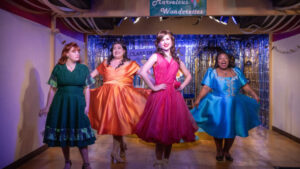 The production is directed by Lauren Katz with musical direction by Aaron Kahn and limited choreography by Dominique Ruffalo. If you know Oil Lamp Theater, you know that this is probably the smallest ( or close to it ) “storefront theater” in the Chicago Area. The stage is tiny and there are only 72 seats. By the way, the four singers are also up for the “queen of our dreams”, so each of us get a ballot and a pencil to use for voting and the results become known right before intermission. I am pretty sure it changes each performance.