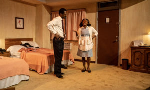 In Katori Hall’s play, “The Mountaintop” we are taken back to that time, but in a fictional way that takes us to the night before his assassination. It is that evening and he has gone back to his motel room to prepare for his next sermon. It is the Lorraine Motel, room 306, Memphis, Tennessee. The set by Kevin Rolfs is powerful in itself. It appears to be what one might expect in a cheap motel in that era. A huge room with two full size beds, a chair and a small table. There is nothing fancy about the room. It is not fitting for a man of King’s stature, but would be what he would take and works well with the story being played out by Hall.