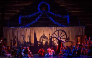 My mother was brimming with enthusiasm for the spectacle to come as we took our seats for Act II. With the rising of the curtain, The Great Impresario, Marie and Prince Peter are deposited at the entrance to the Great Exposition, now a dazzling, and glorious affair, where they are greeted by The Queen of the Fair, also danced by April Daly and attired in a stunning golden ensemble. In a luminous and technically flawless solo, The Queen welcomes the three travelers and ushers them into the dream fair to explore the various foreign pavilions; Spain, Arabia, China, Venice and the Wild West. My mother gasped with delight as the Arabian dancers, Jeraldine Mendoza and Dylan Gutierrez, performed a gorgeous number of athletic lifts and leaps and she was entranced by the explosive performance of Fernando Duarte, as the Chinese dancer, partnered by two splendidly frolicking red dragon puppets.