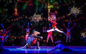 As the festivities wind down, Marie takes the Nutcracker, her gift from the evening, to bed and falls sound asleep lovingly cradling the wooden doll in her arms. To a grunt of disgust from my mother, the rats return and kidnap Franz, awakening Marie who is shocked and dismayed at this turn of events. Fortunately for the two, The Great Impresario triumphantly arrives and, with a wave of his hand, and a little help from the masterful projections of 59 Productions, the bedraggled little Christmas tree spectacularly expands to fill the whole stage. My mother gasped watching the tree burst forth in all its resplendent glory, and her eyes shone as the now full-sized, animated Nutcracker King, danced by Matthews, went into an energetic battle of leaps and turns, eventually slaying the Rat King and rescuing Franz. As snow softly begins to fall, a lovely chorus of dancers in flowing white costumes enter to perform a captivating number, as if in a snow-globe, and the Nutcracker, now magically transformed into Prince Peter, Marie and The Great Impresario board an enchanted gondola that whisks them off into the night to discover all the marvels of this wondrous new world. As the curtain came down on the first act, my mother leaned back in her seat and, with her hand to her chest, heaved an enraptured sigh. “I cannot wait for the next act,” were her emphatic words as we exited the theater to get another glass of champagne. My sentiments exactly.