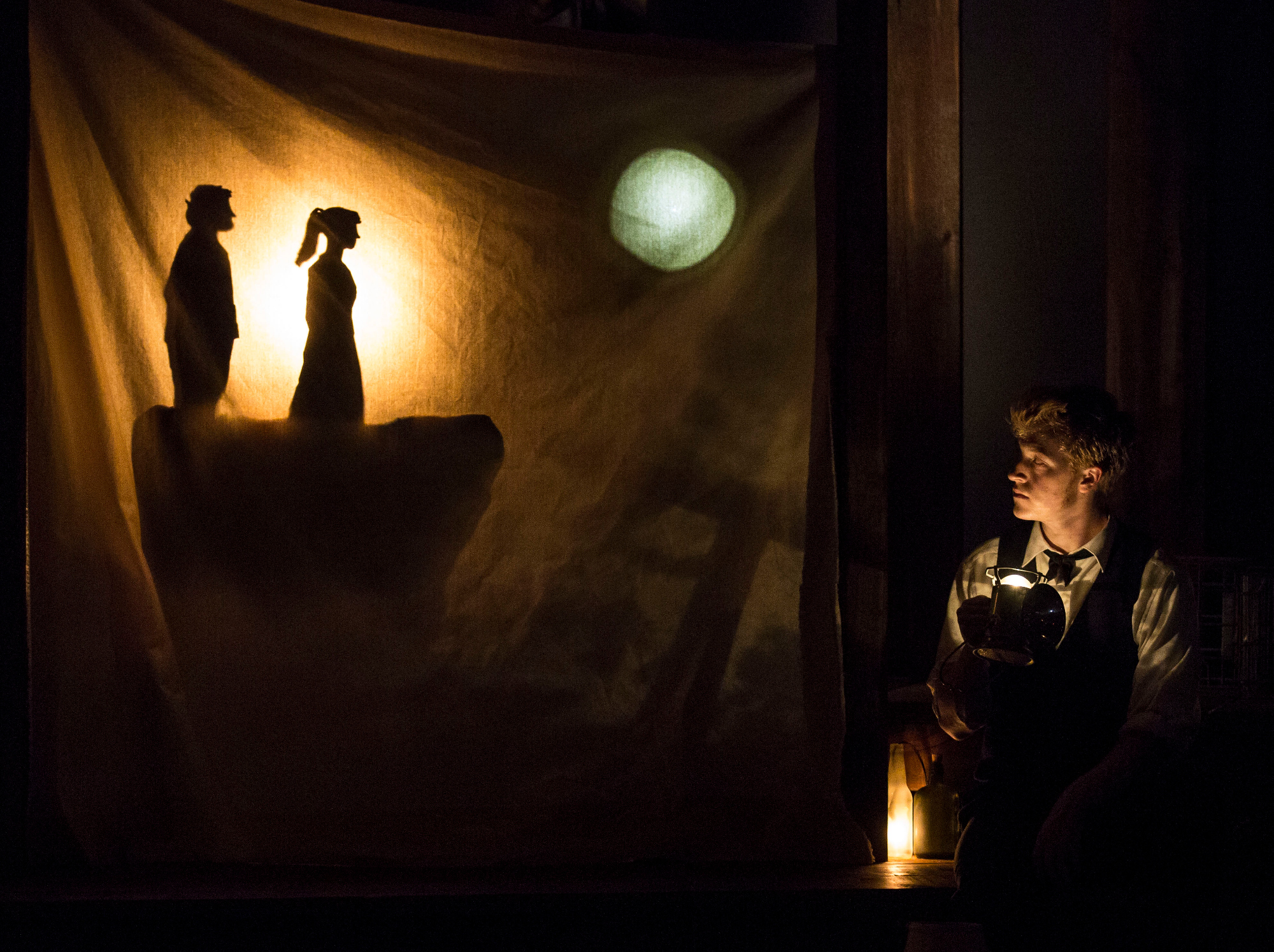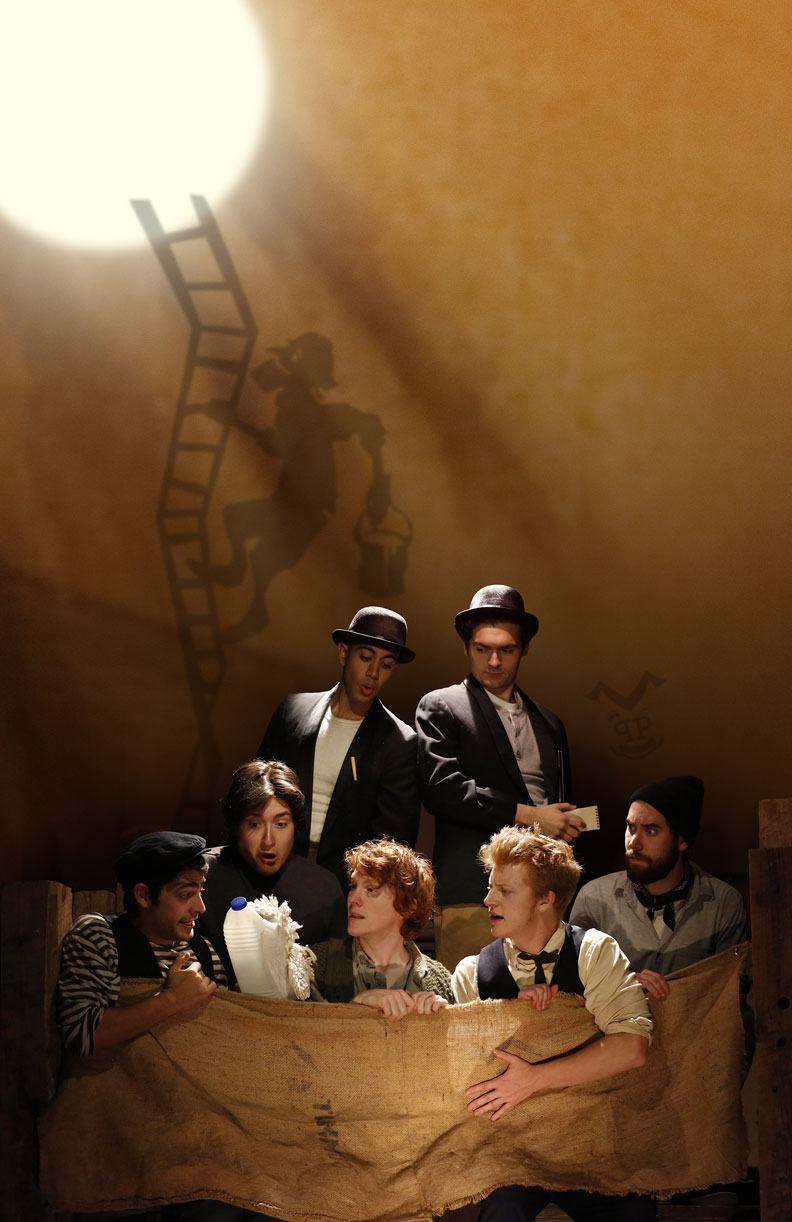 Highly Recommended****The intimate space of the larger of the Writers Theatre venues, Tudor Place, is sheer perfection for the charm and clevernessof a new play with music by PigPen Theatre Company. This is not a typical production for for those who frequent Writers, but is in fact,a folk musical ( an Irish Folk Musical) that blends story telling, puppetry and artistic musical numbers into what one might call , a theatrical experience. Seven very tealented men, under the keen eye of directorStuart Carden ( and the ensemble of PigPen) on a dark set (Lydia Fine and Bart Cortright) take us on a journey for 100 minutes ( no intermission) of an old man ( Ryan Melia, a solid actor) whose daily chore is to refill the spills that the old Moon has each night. That is the spilled light ( which is the cause of partial moons, according to the legends in this tale).
