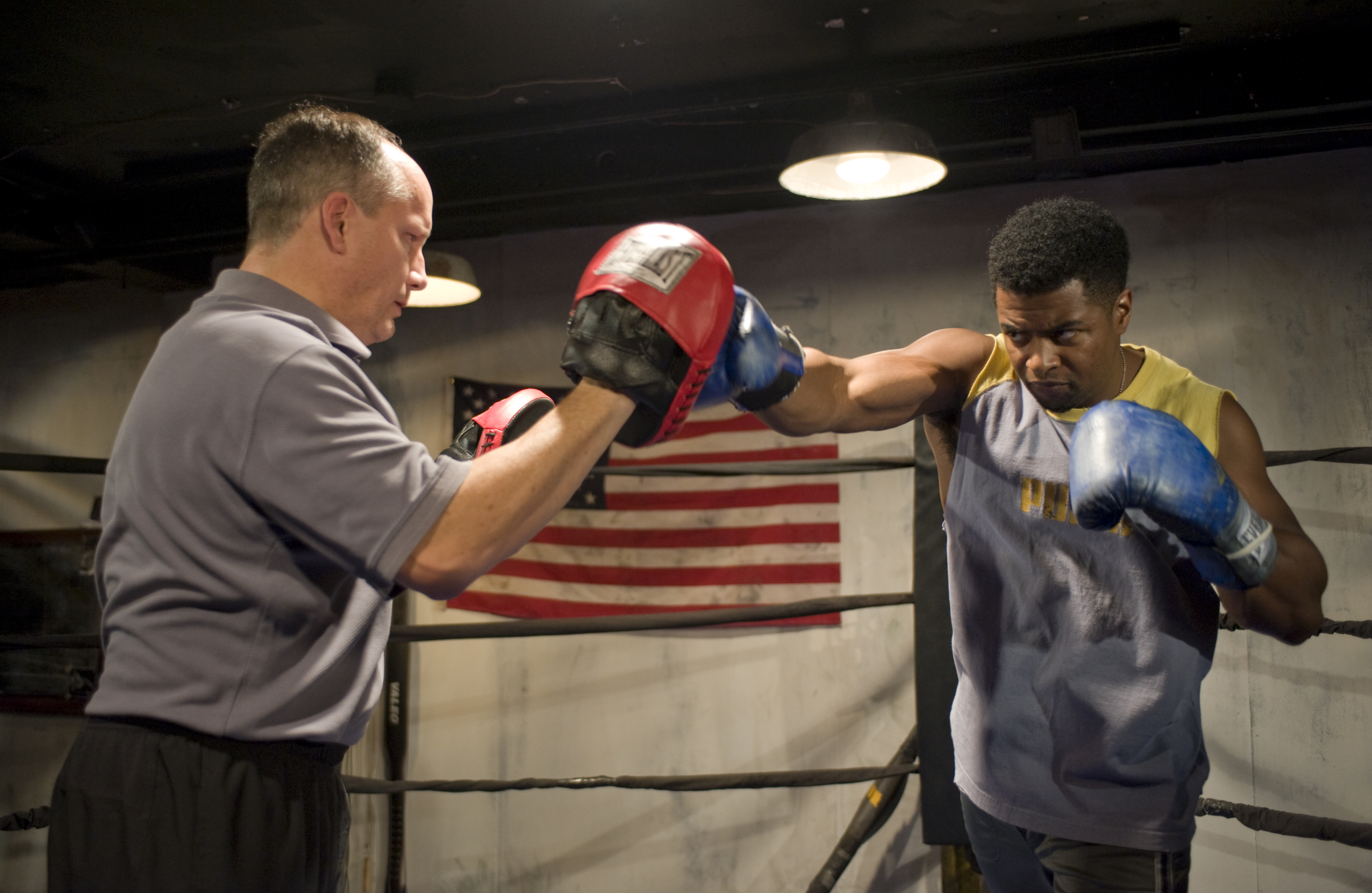 [rating=4] One of our most intimate of theater spaces in Chicago is the cozy A Red Orchid Theatre on Wells Street. Over the years, we have witnessed some marvelous works on their tiny floor they use as a stage. Their current production, a World Premiere by Ensemble Member Brett Neveu ,” The Opponent” is a two character play that involves an ex-fighter, now a trainer, Tre ( deftly handled by Guy Van Swearingen) and a young fighter, Donell ( fiercely portrayed by Kamal Angelo Bolden). The sport of boxing is closely examined in this two act play by Neveu. It is more than just a look at the sport itself, but the effect it has on those who have chosen to participate in this often body crushing endeavor. Not only is the body harmed, but the mind and soul of each fighter is at stake. The conditions they exist in are painful, and as the years go by, unlike other lines of work, they have no further rewards. Many, who never “made it” look back at their lives still feeling that they could have been contenders, but very few ever hit the heights in reality, although in their minds, they were on the way to the title.