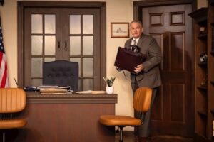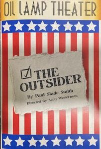 Tonight, at Oil Lamp Theatre, that intimate storefront in downtown Glenview, I felt like the clock had turned back to that time and in spite of it being-3 degrees outside, in the theater it was “hot” with a capital H as we watched Paul Slade Smith’s “The Outsider” come to life on the very tiny stage. Smith’s story of politics and “strange happenings” is a farce that is even more fun in today’s world of political situations, and Director Scott Westerman truly knows how to take the actors through their roles in bringing each character to their place in the puzzle created by Smith.