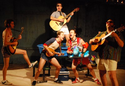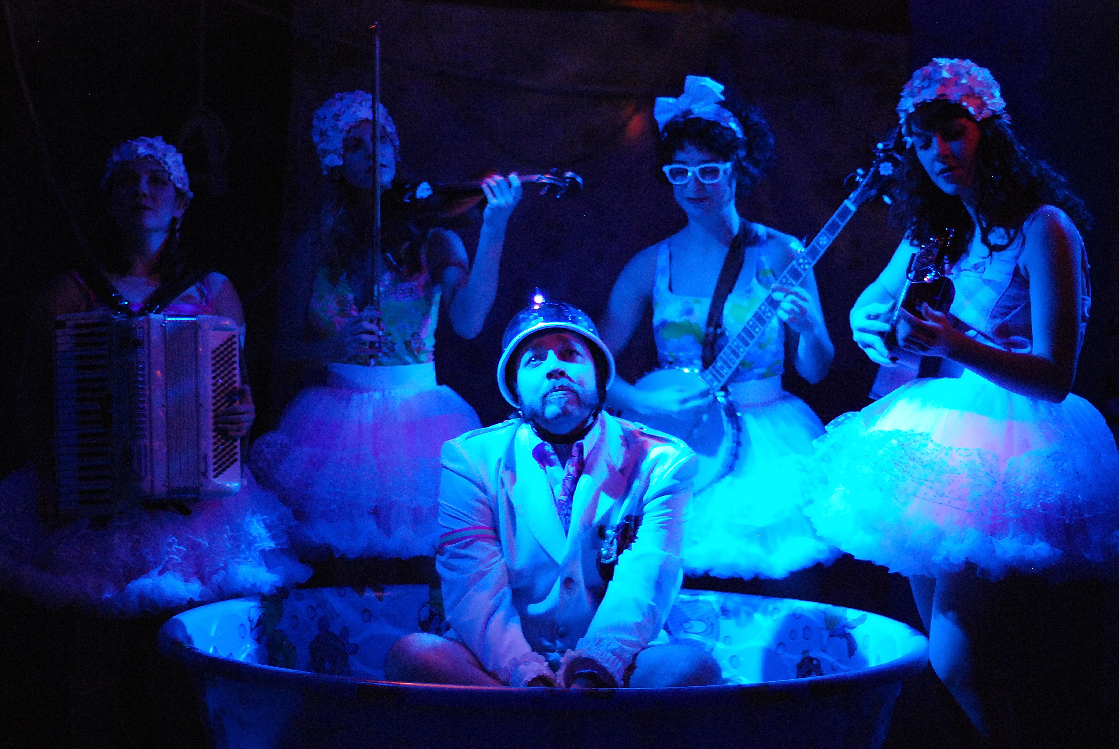 As it turns out, however, Frederic is not really 21 as he was born in a leap year making him about 5 1/2, so he is returned to the pirates to finish his apprenticeship leaving the other sisters ( played with great zest by Becky Poole,Emily Casey and Nikki Klix, all adorable and all very talented musicians). In act, the entire cast is made up of musicians who play a variety of musical instruments. This is another of the Graney touches. We are on a set that is composed of a dock and several smaller stage areas, on tables with kids plastic swimming pools as boats or islands or whatever they need to be. In fact, the entire 80 minutes is done in “promenade” fashion, with audience members ( except for a few seats for older members) moving about the lower level theater at The Chopin. This all works fairly well, except for the large pillars that support the upstairs theater, and a few audience members who do not understand that in this setting, one doesn’t walk in front of other audience members to get a better view. hang low and be casual is the best way to describe how an audience must behave…..think about the others and the actors!