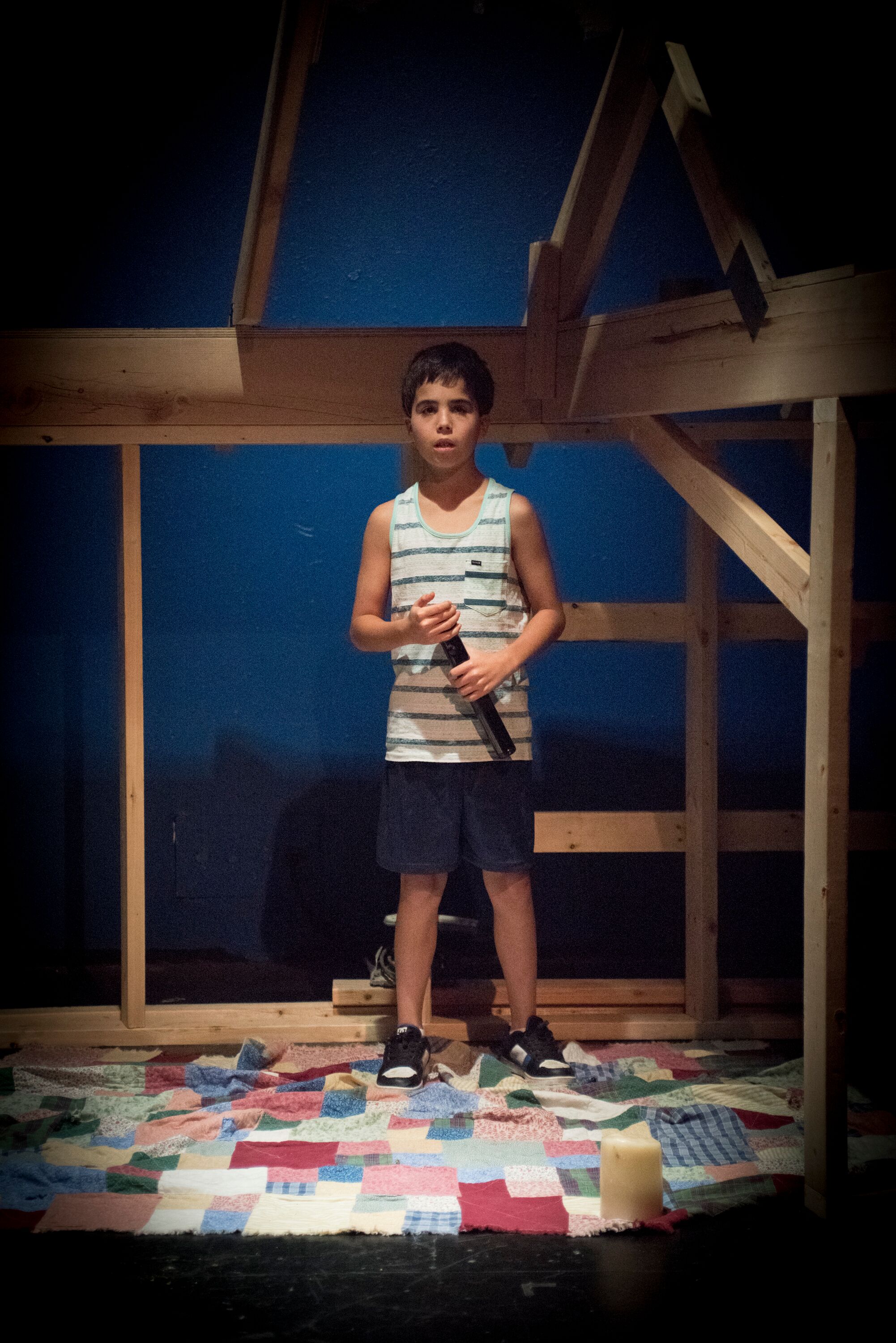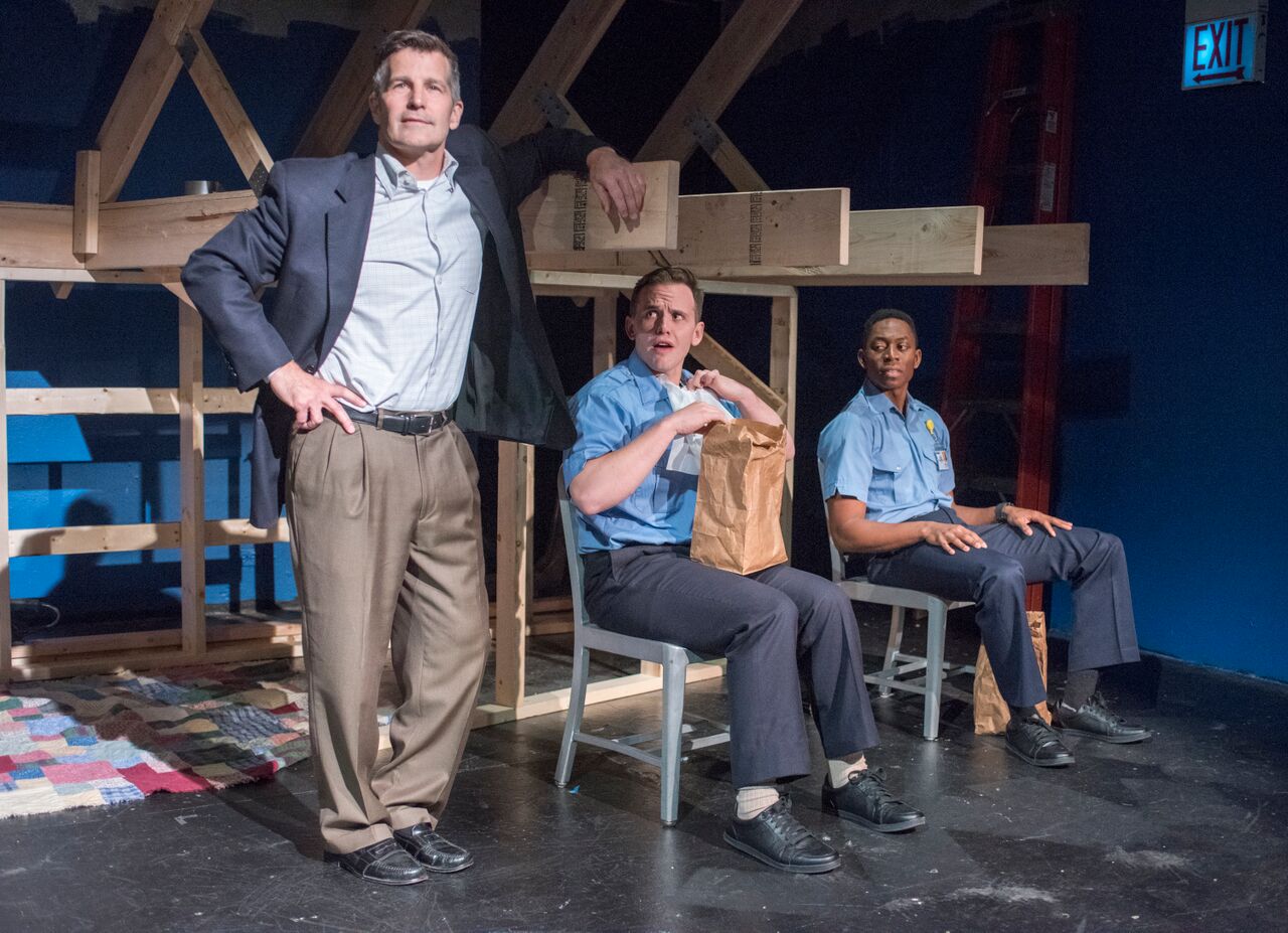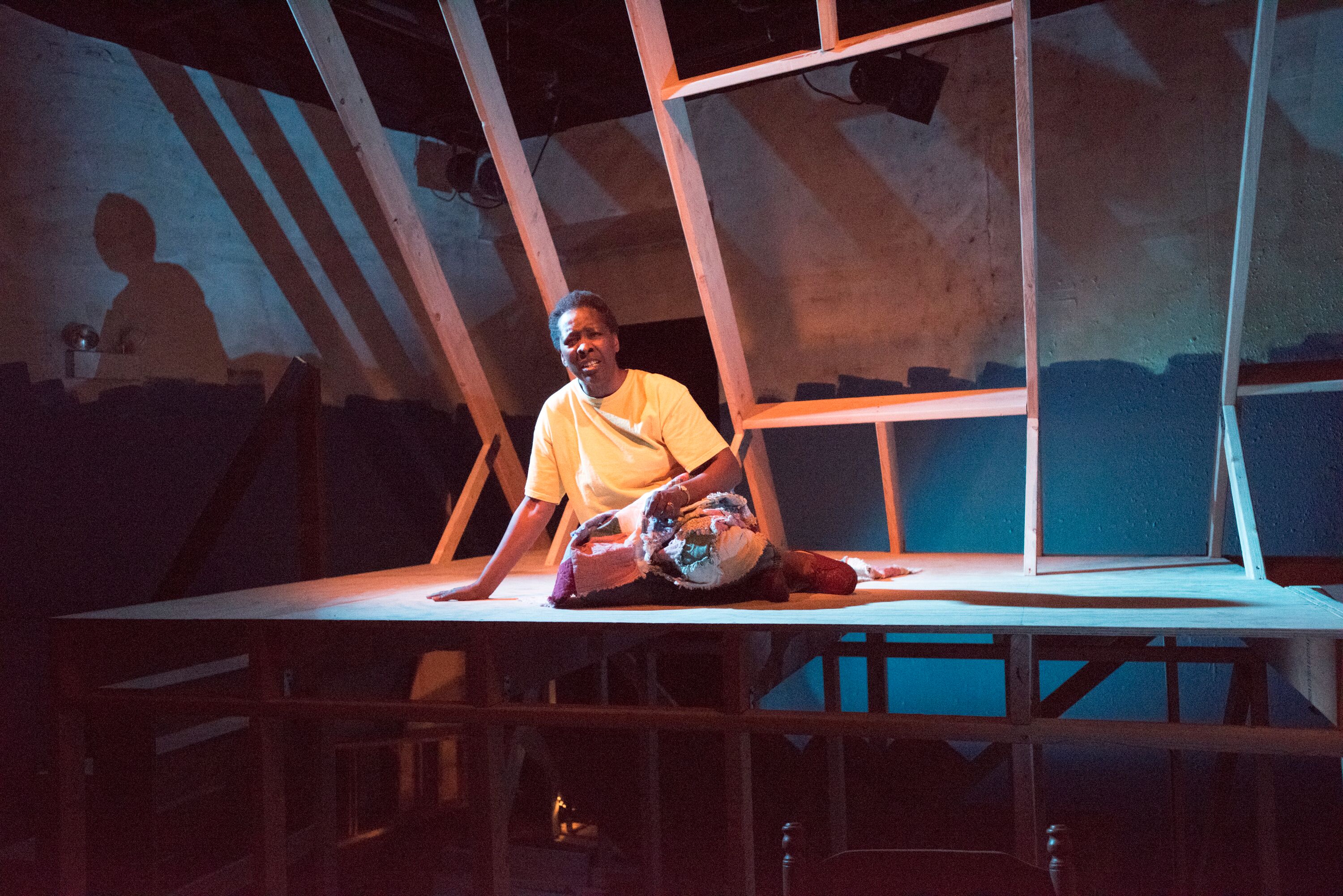 “The Play About My Dad”, written by Boo Killebrew, tells of her father, a doctor in Gulfport, Mississippi, who stayed behind to take care of patients. The play is written in a confusing manner as when we enter the theater, we see what appears to be housing that is being built ( perhaps after the storm) and yet, it is used to symbolize other ports in the storm. The Doctor ( well played by Joe Mack) and his daughter are estranged, and have been for some time. It was Katrina that brought them together and thus her wanting to tell the story. Boo, our playwright (deftly handled by Tuckie White, who gets very emotional in the late scenes) is on the stage (set by Courtney O’Neill) playing with a light board. It is as if we are watching the tale unfold in a staged reading rather than an actual production. There are times that Boo changes the script despite her dad not wanting to do so.mydad3