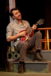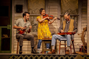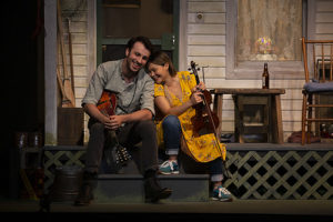 [rating=4] What did you do during the “Covid quarantine? Many of us caught up on all of the TV shows and flix that we had not had time to see. I know that with no theater and many restaurants doing delivery and carry-out only ( unless they had outside dining), we were at a loss. In a new play conceived and directed by Sherry Lutkin, now on the stage at Northlight Theatre in Skokie, we meet a couple, Mira ( played by Lisa Helmi Johanson), a violinist and her boyfriend, Beckett ( deftly handled by Morgan Morse) a folk song collector. They can no longer stay cooped up in in their Brooklyn apartment, so they decide to head up to the hills of North Carolina.