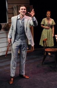 For those of you unaware of the story behind “The Rainmaker”, we are in a major drought in the “dustbowl” of our country, when a flim-flam man shows up at the ranch of the Curry family and tells them that he can save their cattle by bringing in the rain for only a $100. All he needs is 24 hours to produce. Meanwhile, this family has other problems to be dealt with. H.C., the father ( a powerful performance by Robert Frankel) is a widower with three children. Jim, the youngest (Nate Santana who brings a realistic character to the stage), eldest son, Noah ( deftly handled by Daniel Gilbert) who runs the ranch and daughter Lizzie ( Anna Hammonds in a perfect study of the plain, lonely woman living in a male dominated world) who they all want to find a husband for.