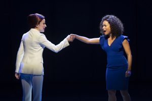 The story and the people who bring it to life are all high energy. Someone in the lobby mentioned that this might be called “How To Succeed In Business” meets “Tootsie”. It kind of does. You also will find that the genius of the lyrics will make you feel that you are watching a Sondheim production. He is the ultimate “wordsmith” making unheard of combinations sound great ( think “Into The Woods” ). It appears that he is not the only magician out there. I always new that Mahler and Schmuckler were creative, but the words and music in this musical are wonderful. In fact in a number or two you might feel that they are into “rap” as well as typical “musical theater” tunes. ( think “Hamilton” and you will hear the sounds).
