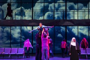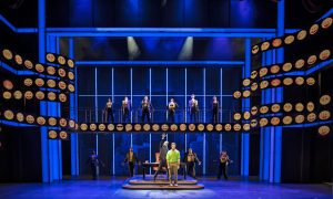 Directed by Greenberg with solid choreography by Amber Mak on a set that is about as Broadway as a set can get (Jeffrey D. Kmiec) and costumes by Mara Blumenfeld ( there had to be 40 changes in Act One alone) this is a very visual show. The sound (Adam Rosenthal) and lighting (Gregg Hoffmann) and the projections ( Mike Tutaj) along with the amazing wigs (Katie Cordits) and the great props (Jesse Gaffney) helped to complete the picture on the tech side. The intimacy and fight choreography was designed by Rachel Flesher and the entire production was managed ( by what is called the “stage manager”) by Amber Johnson. The Stage Manager in this production has to make sure that each costume and wig change is where it must be as every ensemble member goes off as one character and comes right back on as a new one. Tight control and in this production, flawless!.
