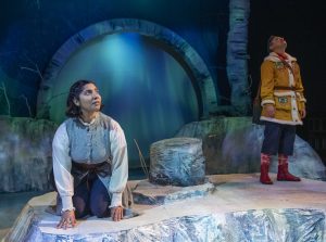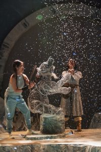 Some of the characters are non-binary. Gerda (Jackie Seijo ) is now Quin and River is many entities. Womoon ( played by the master of physical comedy/performance, Molly Brennan) represent “Mother Earth”. Ms. Brennan also plays Grandmother to perfection. The Snow Queen, Chione ( played to perfection by Vero Maynez) can be described as evil or good. In this version Kai ( Vincent Williams, who also plays Smith) instead of becoming sightless, falls into what appears to be a coma ( or death). Quin and Chione must resolve some issues in order to save him and we travel that route with them.