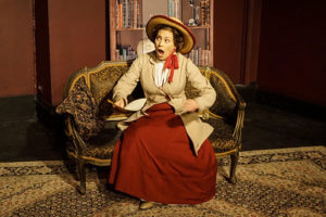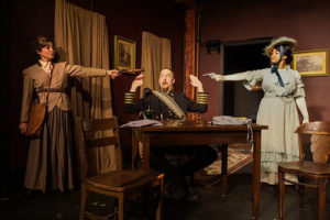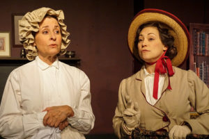 In the first play, Glover uses an elitist upper-class woman (Lucinda Johnston) as a foil, who lectures a charwoman (Megan Delay) who presumes what a woman’s best interest and opinions should be. It is the charwoman, though, who explains the notion of the double standard regarding how women are unfairly treated in the workplace, given lower salaries as compared to men doing the same work, and condemned for not being at home to faithfully care for their husband and children. In the second play, more is made of the fact that some women who are outwardly against the suffrage movement are actually proponents of it. Miss Appleyard (Brittaini Yawn) is initially unwilling to confront her neighbor and tell her upfront that she canvasses for the suffragettes. Only after being seemingly wishy-washy in her discussion of the subject does she reveal her true feelings.