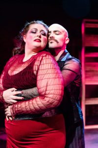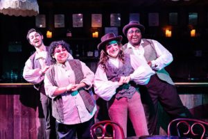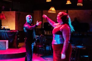 Being a cabaret setting, there is very little in the way of a set but Mara Ishihara has used the areas of the venue to create the feelings that are needed by Anzevina’s direction. The choreography by Jenna Schoppe is cleverly done in order to work around a stage that includes the audience in it. The musical direction by Ryan Brewster and his piano playing is right on and the sound (Daniel Etti-Williams) and lighting (Maggie Fullilove-Nugent) were right on. Cindy Moon’s costumes were creative ( remember, this is a low budget theater company) and the props (Lonnae Hickman) nicely done.