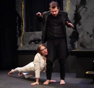To get this out of the way: there is nothing wrong with Dennis Bisto’s face. Much of the show’s absurd humor comes from how Lette’s face doesn’t change at all after the surgery in any way that the audience can perceive. But what does throw off the audience’s perception is that not only are several roles double-cast, but that different characters share the same name. Scheffler is not only the name of the innovating plastic surgeon, but of Lette’s ruthless boss (David Lovejoy). Karlman is the name of Lette’s suffering underling (played by Matty Robinson), but is also the name of the smothered son of one of his business prospects (the prospect is played by Juliet Huneke, the son by David Lovejoy). The use and limits of individual identity are a major theme of the play, and even before the characters develop the ability to literally share the same face, they are constantly having to defend their value against competitors for the same relationships. Lette’s boss phrases this explicitly in terms of monetary value, but after his enhancement, Lette informs his wife that she must up her game if she wants to maintain sexual or romantic access to a man other people desire.