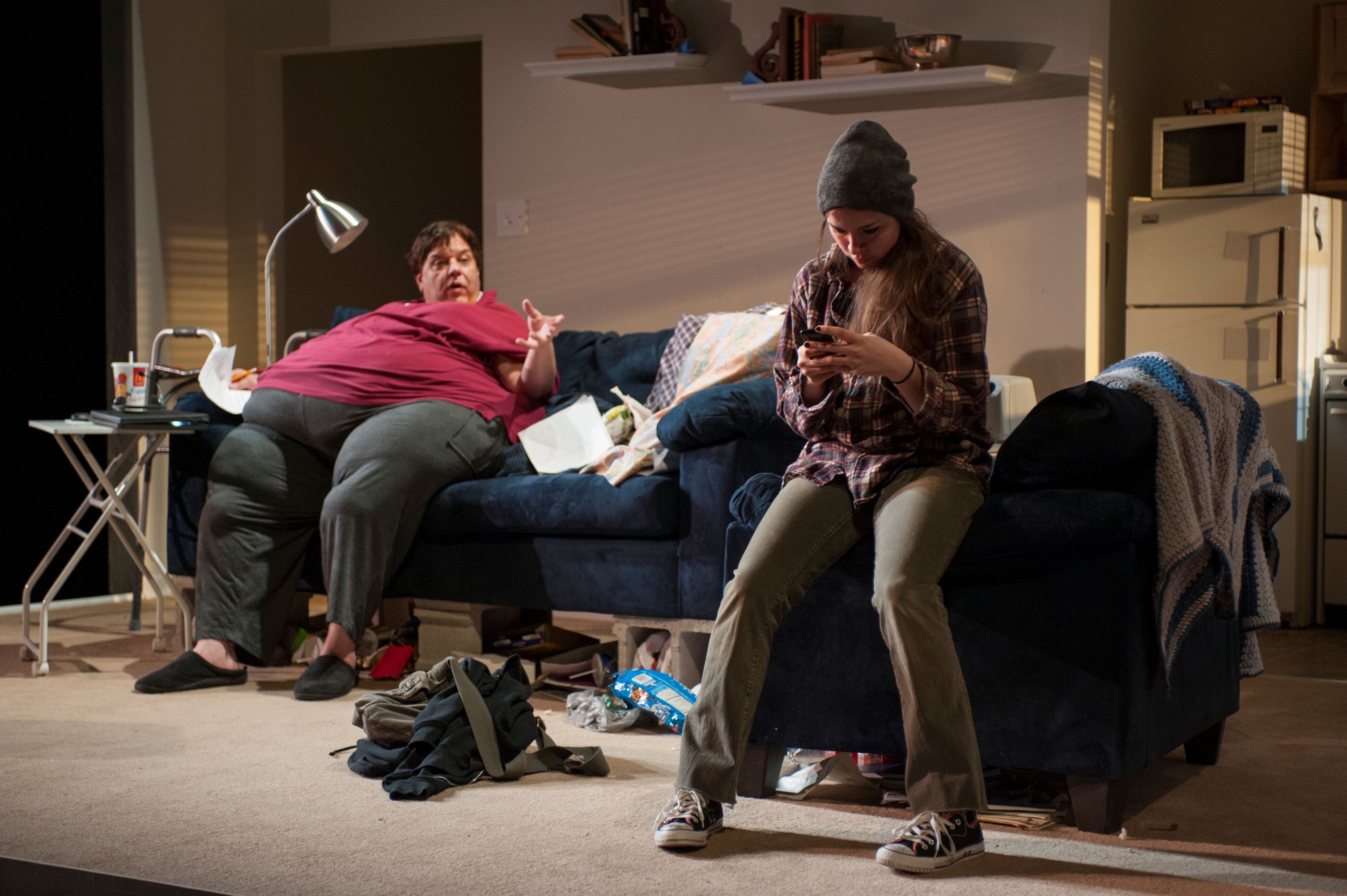 [rating=4] What happens to a man when all his life choices go against the grain? It is hard to deal with life in a small town when you are “different” and in a small town, everyone knows enough about all their neighbors. In Samuel D. Hunter’s Chicago Premiere of “The Whale” now onstage at Victory Gardens Theater, we are in such a small town , in of all places Northern Idaho. As the play opens, we see a messy studio apartment, in which Charlie, our main character resides. Charlie is obese, weighing in at probably 600 pounds or more ( Dale Calandra, full dressed in a “fat Suit” truly pulls off this difficult role). Charley lives alone, and since his boyfriend died has been eating himself to death , so to speak. He is unable to leave his apartment so he has become an online tutor working with students who are in need of guidance. His neighbor and friend Liz ( deftly handled by Cheryl Graeff), a nurse, makes sure he is okay, but truly would prefer he get medical attention.