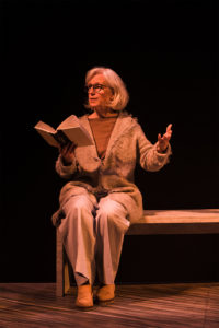 A black background, a white bench, and a long semi-U-shaped wooden runway make up the bulk of the stage. This simple but elegant scenic design is the creation of Yeaji Kim. Especially poignant are the two lighted cubes between areas of the runway. The larger cube is supposed to represent Didion’s deceased husband, and the smaller cube represents her daughter. At the very end of the performance, the light in the larger cube dies first, followed by the light in the smaller cube. This is an interesting analogy, but my initial thought was “Why a cube?” “Why not some other shape?” (This reminded me of the original “Star Trek” episode where the crew members are transformed into polyhedrons, but I digress.)