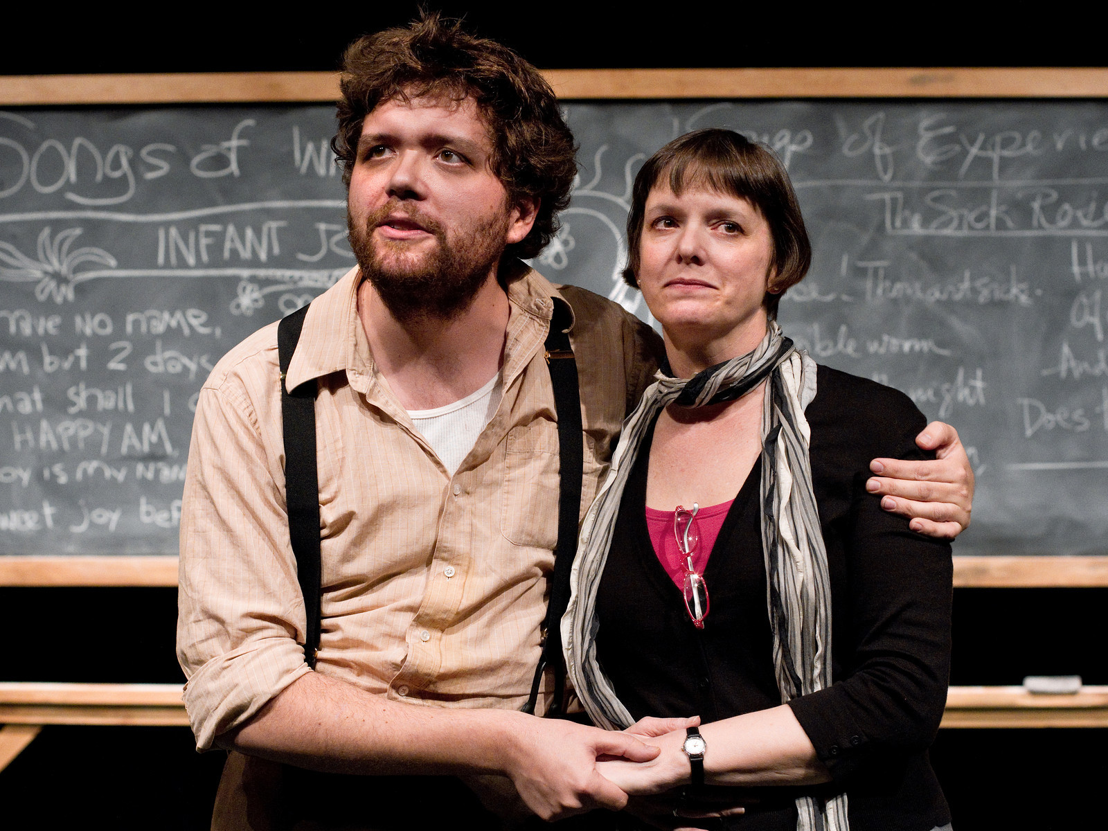 Bernard ( a powerful and comedic touch by Colm O’Reilly) is an ex-folksinger who lectures on the poet William Blake.Bernard is a barely published poet himself but is known for his deep analysis of Blake’s “Songs Of Innocence”. His lover, Ellen ( a dynamite performance by Diana Slickman, who many have seen on Chicago’s stages, but only those lesser known) is a noted scholar on Blake’s “Songs of Experience”- together they cover this man’s true meaning and together they share their experience and love for his work. They have decided that since these works deal with the power of joy and it would best to show their students the joy of love, to have them all attend a special event in the wooded are of the campus. Here they bare it all and make passionate love, with all their students in attendance and as it turns out in full view of the dean.