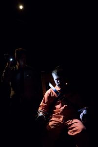 The image of the convict strapped into the electric chair at the beginning of the play is a particularly disquieting one. We are left to contemplate him in silence for several minutes after entering the theatre. The show begins with a terrible ruckus, and the executioner, Leonard (Christopher Donaldson), shouts that there has been an earthquake of unknown proportion. He tells the convict (Logan Hulick) that the destruction of the entire rest of humanity is a real possibility, although we never know if or why this is. At any rate, the room is running on emergency power, nobody else can enter, and it is unclear how long the present situation will last.