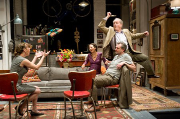 Directed by Austin Pendleton on a slick set by Walt Spangler filled with great “stuff”, I found myself wanting to get into this story, but with the problem in hearing the two lovers in confrontation, I know that focus was hard to keep. I struggled to hear every word and also see the action. Their loft apartment had lamps, but they left the lights off for a great part of the first act, so not only could I not hear them, it was difficult to see them.