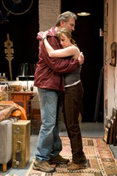 Somewhat recommended** It is not very often that I am not mesmerized by a production at Steppenwolf Theatre Company ( upstairs , downstairs or at the Garage), but their latest offering, in the Upstairs Theater, “Time Stands Still” by Donald Marguilies, left me a little flat. The story is about a photojournalist, who it turns out lives her life for the excitement of the danger in the hotspots where war and danger lurk around each corner. Sarah ( Sally Murphy, who I regard as a top actress, but find that she forgets one of the first things an actor learns- to play to the back row) has survived a bomb blast in Iraq and has been sent home to recuperate. Her long time boyfriend,James ( deftly handled by Randall Newsome) is there to take care of her and tend to her needs. He is in hopes that she will settle down and stay home, get married and raise a family. She doesn’t see this as her life as danger and the drama of war is what she needs. Her editor, who is also their friend,, Richard ( a solid performance by Francis Guinan) has settled down with a much younger woman, Mandy ( Kristina Valada-Viars) and in seeing their happiness, James pushes even more for this type of life.
