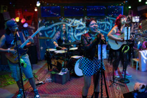 There are some talented people in this hard working cast. The direction by Claire Divizio does bring out the rock concert part along with the story-telling that allows each member to express their own feelings and possibly allow them to “come of age”.The music for this play is very “rock” and is conducted by Ellie Kahn. The characters in the play, other than Thelma /T (Carolyn Waldee) and Louise/L (Claire Guthrie) are: Cubby ( Jack Chylinski), Blazer (Jeff Rodriguez), Marie (Bailey Savage) and Henrietta (Crystal Claros). All of them play instruments as well as sing some wild music. The music is by Brandon James Gwinn who also wrote the lyrics with Ellarose Chary ( Chary wrote the book).