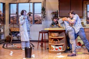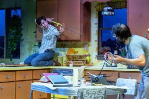 Austin ( a powerful performance by Jack Ball) is a writer and would be considered “the good son”. He is working on a script that he is hopeful to sell, and is taking care of his mother’s house in California while she is in Alaska. We spend all of the play in the kitchen of this house ( the set by Lauren M. Nichols is wonderful and very realistic). Austin’s older brother, Lee ( played to perfection by Ben Page) has been estranged from him and their family for some time. He shows up when he needs something ( drugs, booze or whatever). This is one of those times.