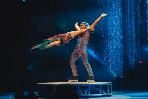 As per usual with Cirque shows, we have wonderful performances by our cast of players, who sing and dance, roller skate ( an amazing duet that will have you concerned about these skilled skaters), juggle ( our narrator, who becomes, or perhaps is already, St. Nick, tumblers who represent the 8 reindeer that will do amazing things before some deliveries and a host of other performances such as lights on a rope twirling from one side of the stage to the other and then from the audience to the stage and last, but not least, around two audience members brought onstage. WOW!