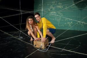 With a very simple set, mostly a black board and a chalk floor these two actor’s portrait the young children that were in the school and tell the story of the ordeal, with the use of dance, gymnastics, music and voice. For 60 minutes these two actors from Belgium, Gytha Parmentier and Roman Van Hautven can hold your thought and mind as they tell this chilling story with a sense of humor that a young child can display.