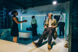 Things do not go the Detective’s way. Despite Choubert’s claimed fealty to detachment, he has a lot of trauma to work through which his subconscious evidently considers more important than finding the Detective’s quarry. Van Swearingen’s physicality as Choubert is nothing short of amazing. The frustrated Detective puts him through a gamut from swimming through a marsh to climbing a mountain, all of which he enacts using a bathtub and a few other ledges and pools at the margins of the stage. On a relatively blank set designed by Danila Korogodsky, director Shira Piven finds a pathway for Van Swearingen that is described so vividly it is visible to the audience (although evocative, symbolist projections help us get in the proper mindset).