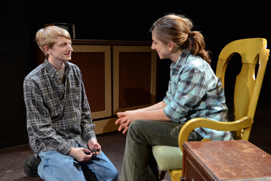 In my mind, the key to understanding the play is the eponymous Christmas Hymn (this play is set in February: nowhere near Christmas or even the Feast of the Epiphany) which Grace (Anne James) hums for comfort: “We Three Kings of Orient are, bearing gifts we traverse a far.” Gifts by each of the three main characters in this play are sought and denied, offered and rejected, given and inefficacious. They are things as tiny as a meal, biscuit, or even a piece of soap. As the play opens, Dustin (Adam Shalzi), a lonely and awkward young man, is making dinner for his only friend Daisy (Stevie Chaddock) whom he loves and on whom he has a slight crush. She complains that he keeps ruining her eggs, mocks his dirty nails (he has a green thumb and works as a gardener even in dead winter), and tells him that he will never find a girl.we three2