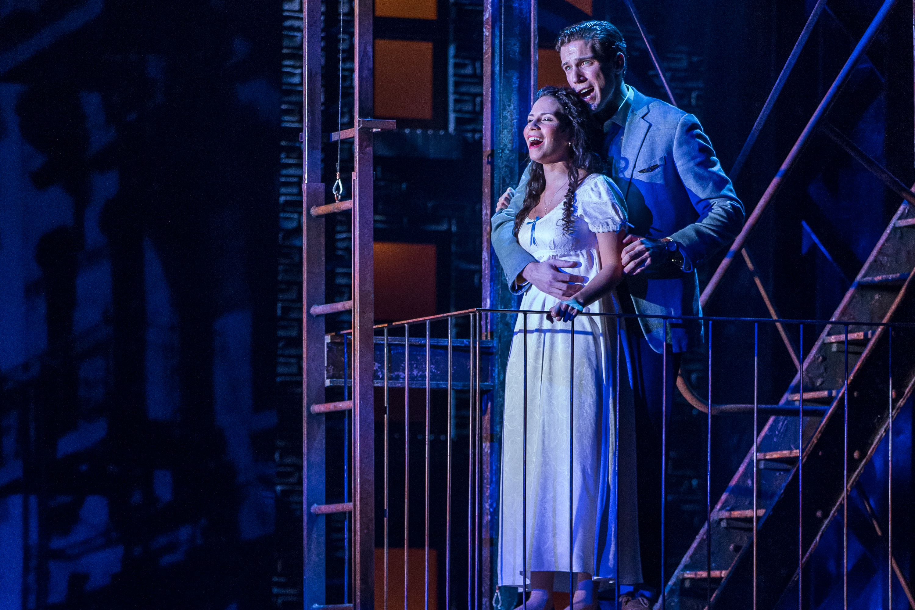 Other notable performances in this production, Rhett Guter as Riff, leader of the Jets, Chicago favorite Roger Mueller as Doc, Brett Tuomi as Lt. Shrank and John Gray as Officer Krupke. Maria’s parents are played by Ofelia Ortega and Ruben Serna, and the “Somewhere” soloist in a very special rendition is Lauren Villegas. As someone who has been involved in the Hispanic community for many years, it is nice to see that this cast has many Latinos in it. Gracias, Drury Lane! Once again- great acting, spectacular dance and voices that make the words dance into your minds, hearts and souls. The musical direction (Roberta Duchak does her thing) and the orchestra, under the direction of Ben Johnson fills the theater with this historical musical about  hope.